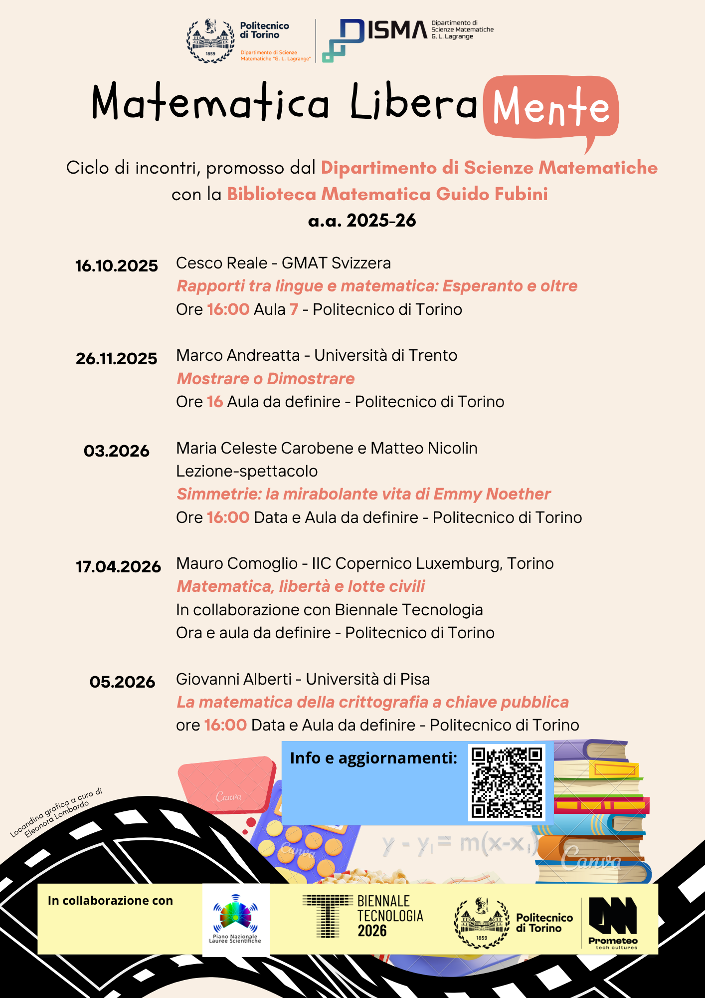 L’edizione 2025/26, aperta anche alle scuole in collaborazione con il Piano Lauree Scientifiche e Biennale Tecnologia, prende il via giovedì 16 ottobre dalle ore 16,00 alle 17,30 nell’Aula 7 del Politecnico di Torino con l’incontro dal titolo “Rapporti tra lingue e matematica: Esperanto e oltre”.